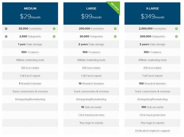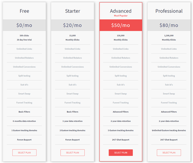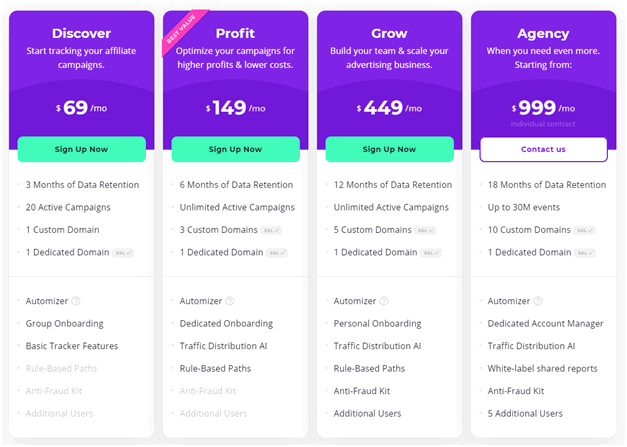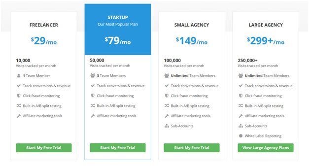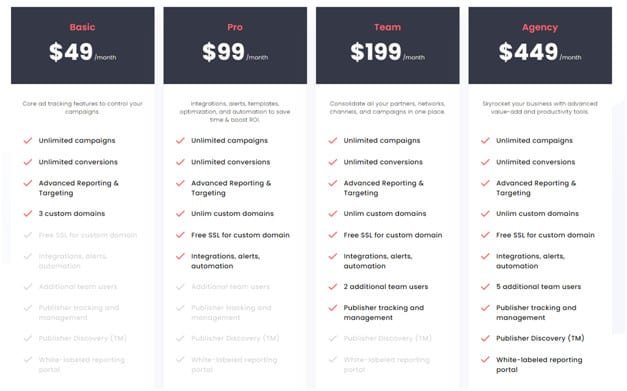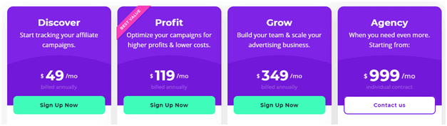 Voluum offers 4 different pricing plans for you to choose from. Also, the price differs when you choose to pay monthly: