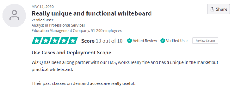If you choose between professional and enterprise plans, you need to ask the sales team for a plan, depending on the number of teachers and students you plan to take on. If you are not quite sure about the usage pattern, however, you can consider the pay-per-minute plan where participant minutes are computed by multiplying the number of participants with the class duration. For full feature comparison, see WizIQ   (19)