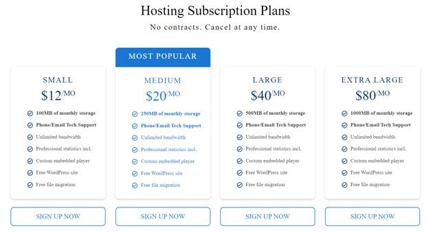 Except for the lack of a free, no-obligation plan, Blubrry is affordable. After all, you get unlimited bandwidth for each plan. You can cancel your subscription at any time too.