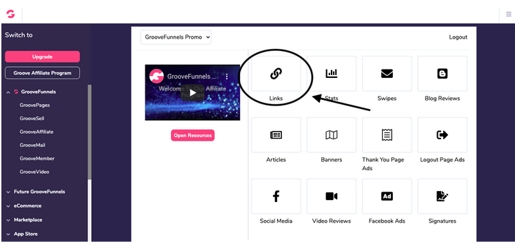 In this menu, you will find various affiliate links for GrooveDigital products including backdoor deals. By using these links to promote GrooveFunnels, every person you get to click and signup for a free account will be tagged with your code for life.