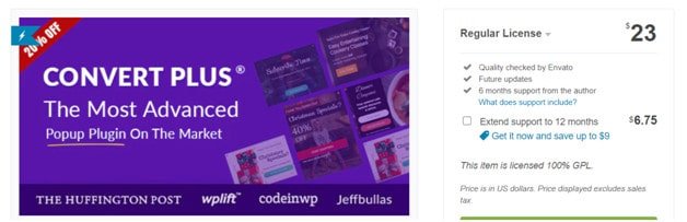 The Convert Plus pop-up plugin for WordPress is available at Envantomarket (3) for $23 valid for 6 months. You have the option to extend the support for up to 12 months by adding $6.75.