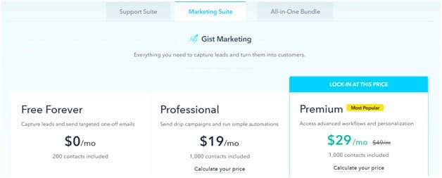 Gist offers a range of pricing plans that allow you to choose from their Support Suite, Marketing Suite, and the All-In-One Bundle. Pricing starts with a free plan for at least 200 contracts for their Marketing Suite.